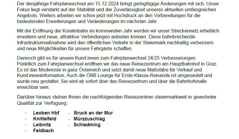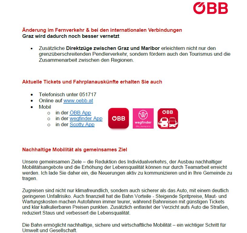 Mit diesem Schreiben werden Sie auf die Neuerungen und Verbesserungen im Fernverkehr und im steirischen Regionalverkehr informiert.